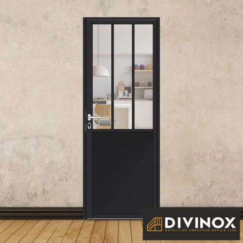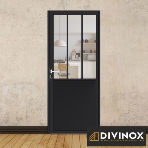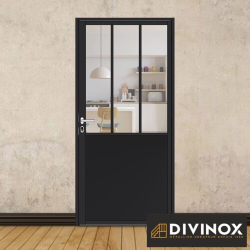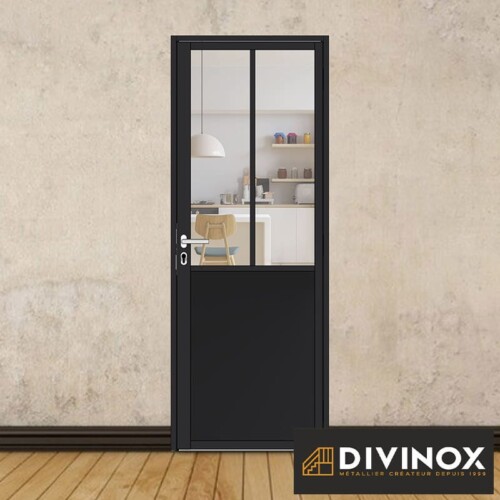 Le soubassement métallique renforce la protection de la partie basse de la porte contre les chocs et l’usure, tout en offrant un style industriel et moderne.