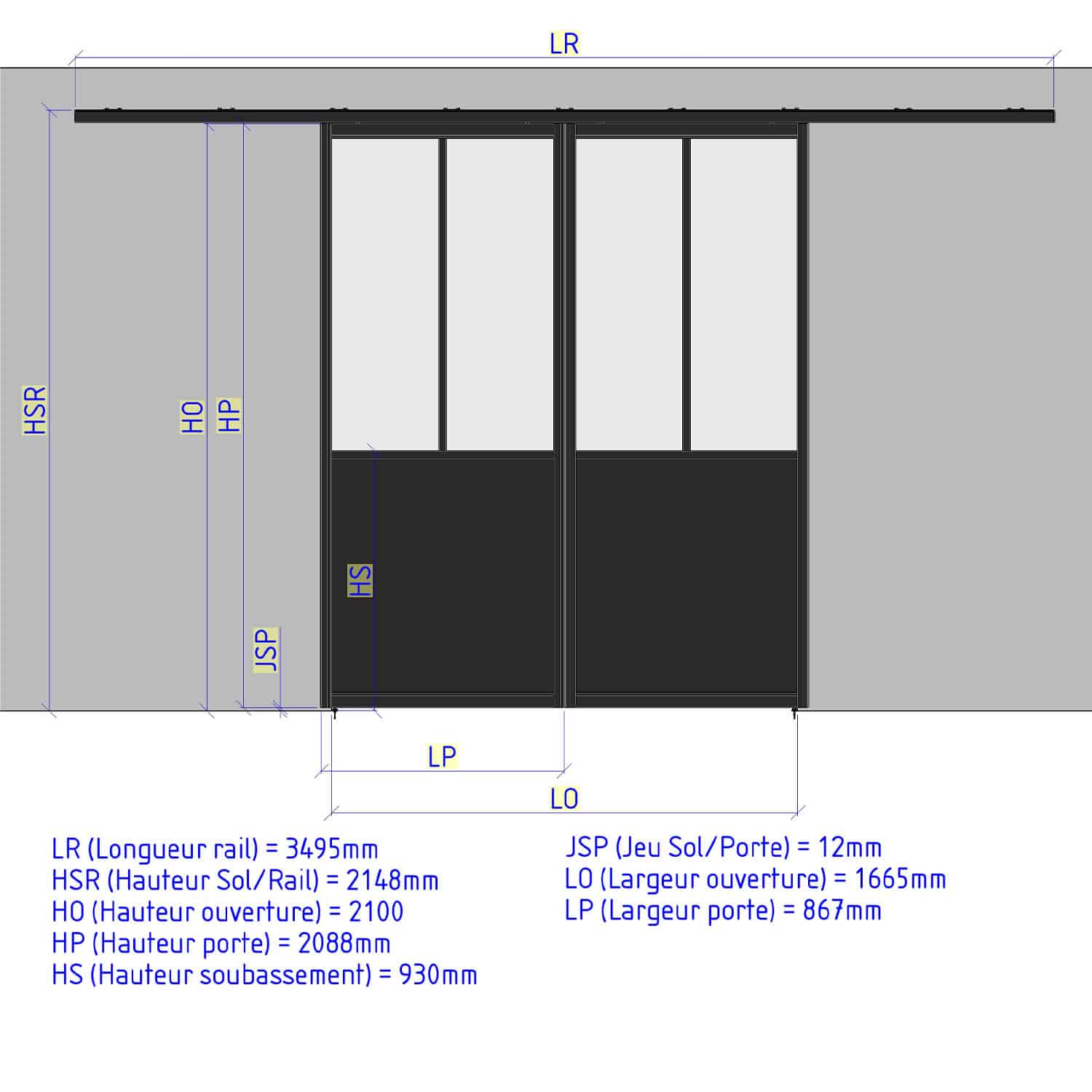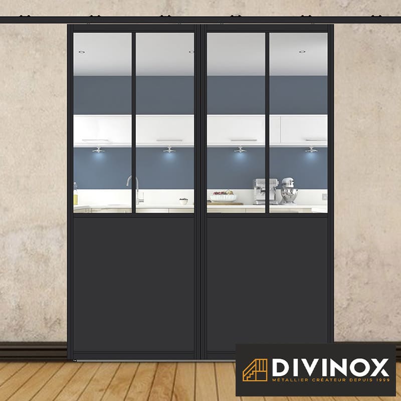 Dans l’esprit de nos verrières d’Atelier, découvrez nos doubles portes coulissantes simples en aluminium fixées sur rail, livrées en KIT à monter-soi-même.