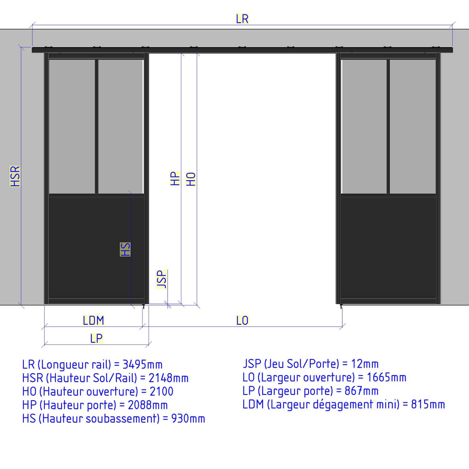Double porte coulissante H 2088 x L 867 mm – 2 sections verticales + soubassement bois